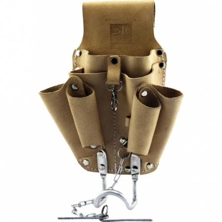 Kieszeń na narzędzia, skórzana. - wykonana ze skóry juchtowej świńskiej - jedna duża kieszeń, w której znajdują się cztery małe przegródki idealne np. na śrubokręty - sześć mniejszych kieszeni na różnego rodzaju narzędzia - metalowy uchwyt na młotek - przywieszka do dopięcia kluczy - łańcuszek na końcu którego znajduje się cienki ok. 12 cm metalowy drut zaostrzony z obu stron - zakładana na pasek - w kolorze naturalnym