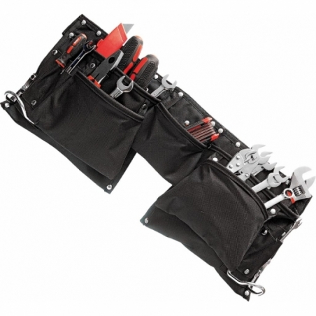 Pas monterski – podwójny. - wykonany z mocnego materiału - dziesięć kieszeni na narzędzia: dwie duże oraz osiem mniejszych - dodatkowo kieszeń między dwiema dużymi - idealna na gwoździe - dwa metalowe uchwyty - regulacja w pasku - wszystkie narzędzia są w zasięgu ręki - idealny dla monterów