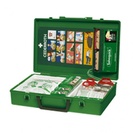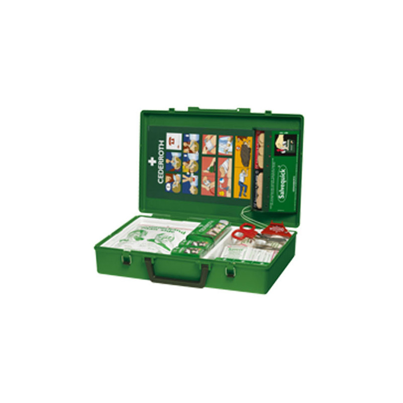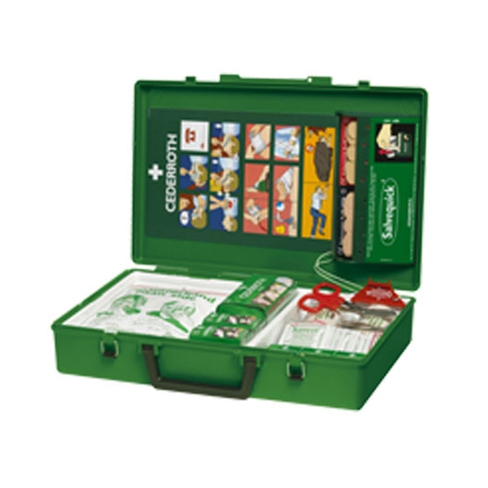 Duża skrzynkowa apteczka pierwsze pomocy z praktycznym uchwytem do przenoszenia, w każde potrzebne miejsce, gdzie trzeba zareagować natychmiast. Skrzynkę można umieścić na ścianie w widocznym miejscu na specjalnym uchwycie.