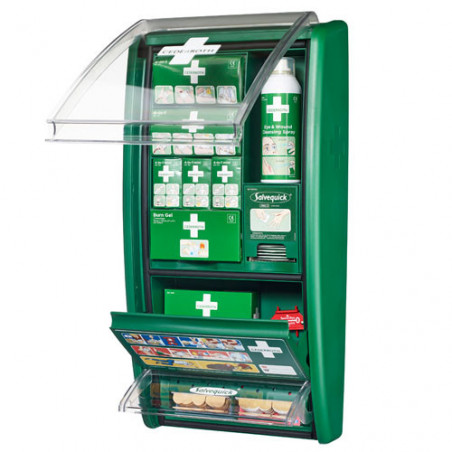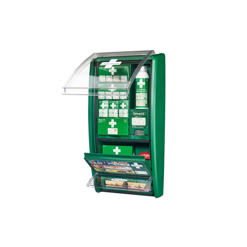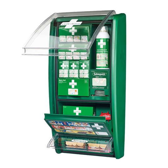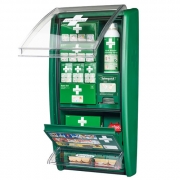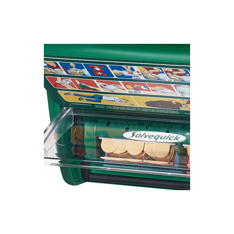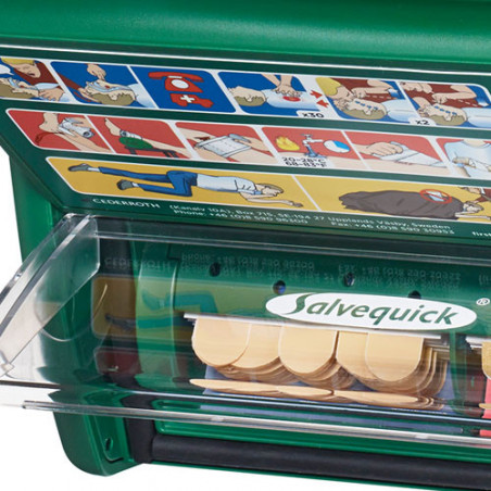 Apteczka pierwszej pomocy z udoskonaloną zawartością, przystosowaną do wielu rodzajów ran. Opakowanie plastrów są na stałe zamocowane w podajniku, aby nie zostały one nieumyślnie usunięte, a opakowanie wymienimy za pomocą specjalnego klucza.