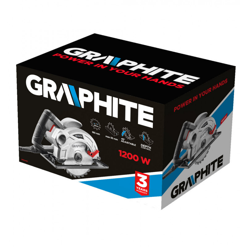 Pilarka tarczowa 1200W, tarcza 165x20 mm, obroty 5500 min⁻¹, cięcie pod skosem 0-45º , gł. cięcia 55/35 mm (90º/45º ), masa 3.5 kg, regulacja głębokości oraz kąta cięcia, akcesoria: prowadnica równoległa, klucz regulacyjny, tarcza do cięcia - 1szt.