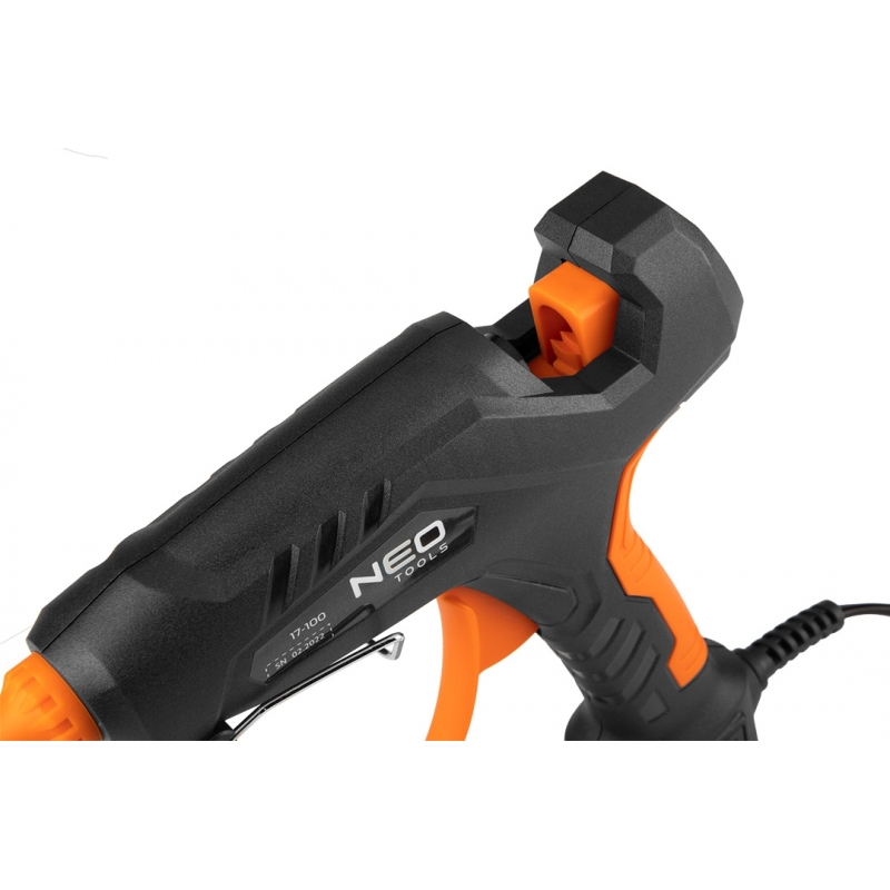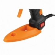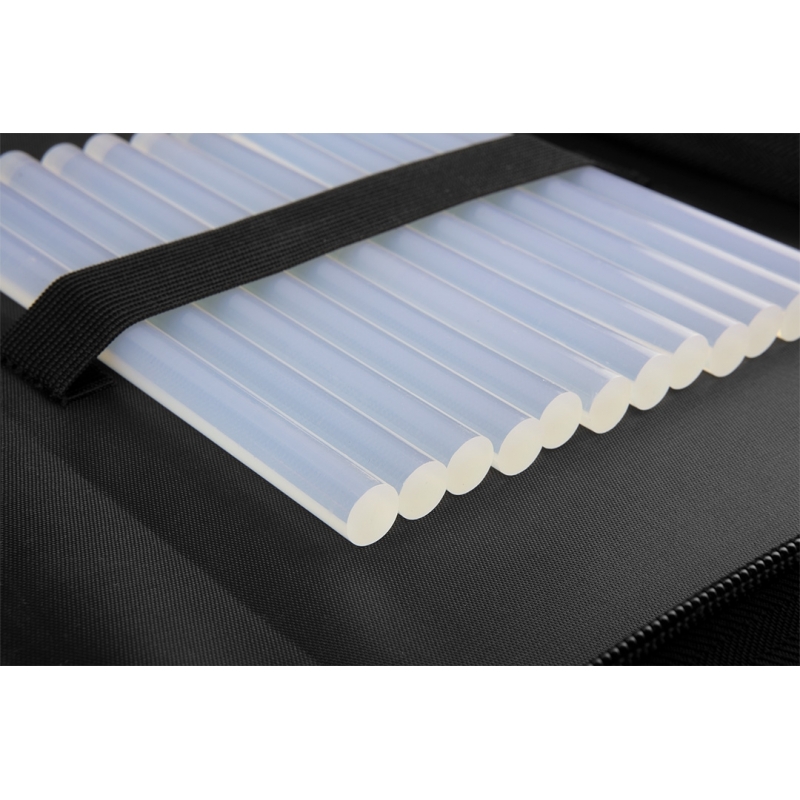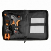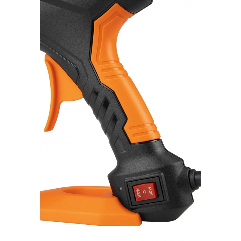 Pistolet klejowy o mocy 60 lub 100W. Dostosowany do wkładów 11 mm. Dwie temperatury pracy 120 i 190 stopni Celsjusza. Wyposażony w bezpiecznik, podświetlany wyłącznik i wydajną grzałkę ceramiczną PTC. Dysza miedziana, wymienna, z systemem zapobiegania kapaniu. Czas nagrzewania 3-5 minut. Dodatkowa podstawka z tworzywa poprawiająca stabilność. Uchwyt profilowany. W zestawie: pistolet, podstawka, 12 sztuk kleju 11 mm, 3 osłonki na palce, wszystko zapakowane w materiałowe etui zamykane na zamek błyskawiczny.