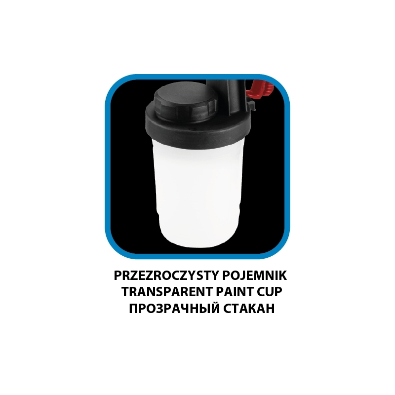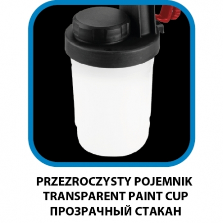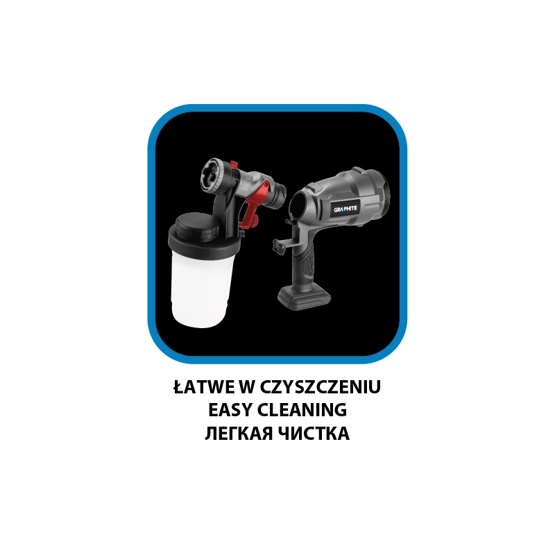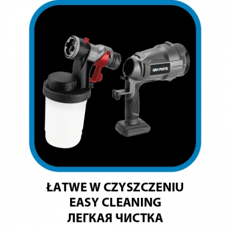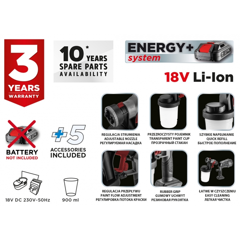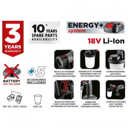 Pistolet natryskowy HVPL Energy+ 18V, dysza 2,5mm, max lepkość 60DIN-s, Moc 243W, pojemność 900ml, natężenie przepływu wody 700ml/min, kubek lepkości, dysza, pierścień uszczelniający, klucz specjalny, igła do odkręcania dyszy, igła czyszcząca, masa 1,45kg, kompatybilny z akumulatorami Energy+