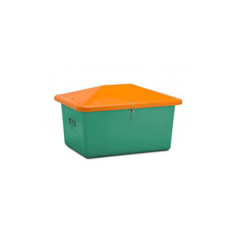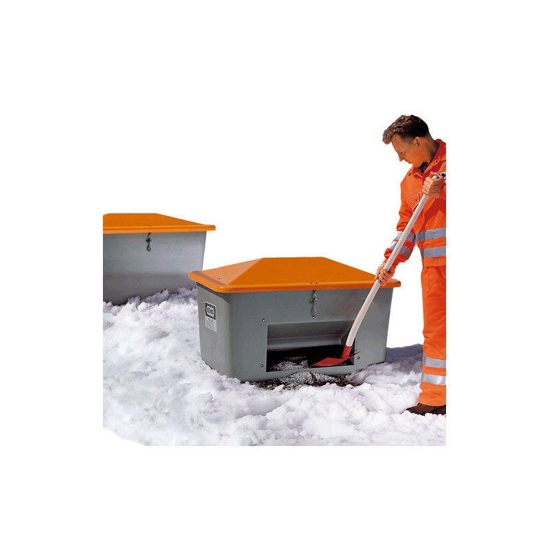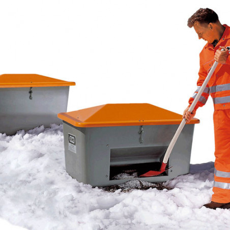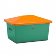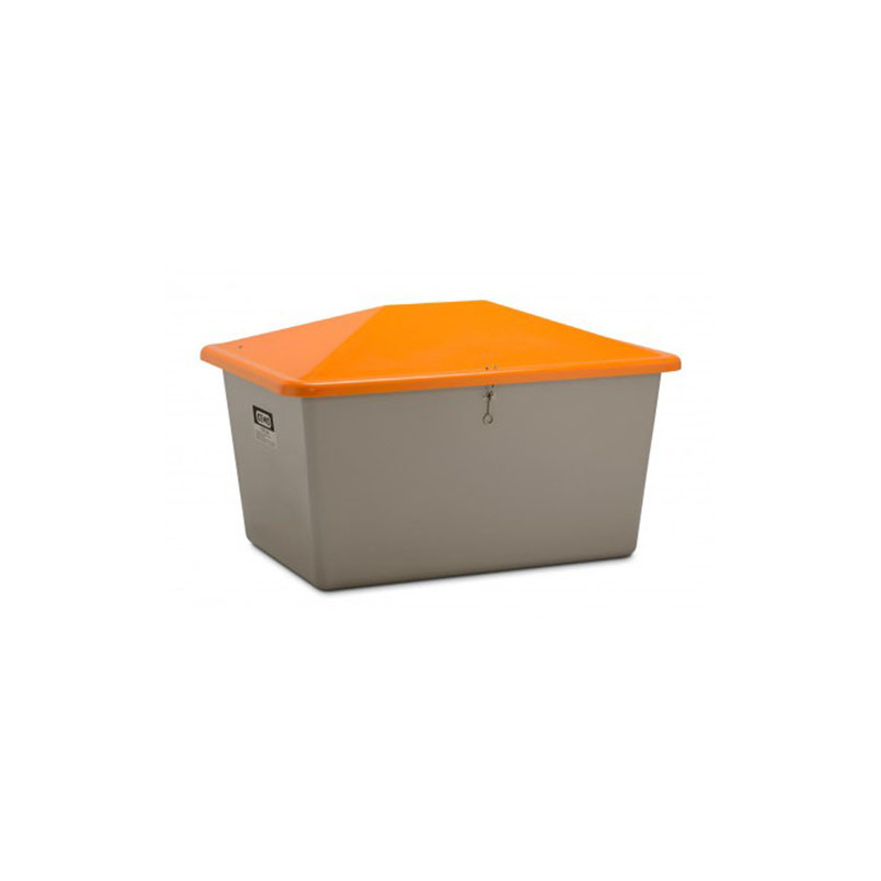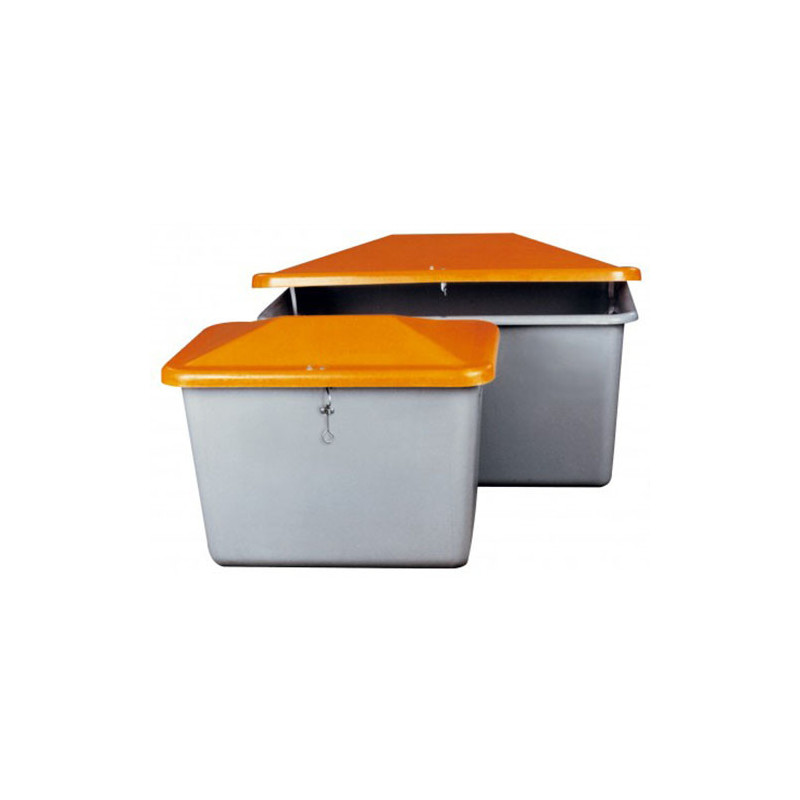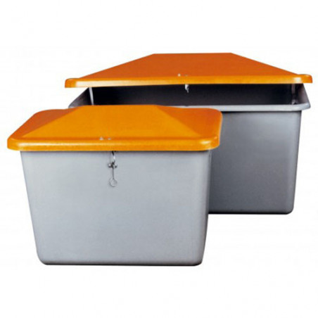 Pojemnik na piasek / sól / żwir wykonany z włókna sztucznego. Pojemniki są odporne na działania atmosferyczne oraz korozję. Istnieje możliwość sztaplowania pojemników, co daje oszczędność miejsca podczas ich magazynowania. Pojemnik zamykany na zatrzask ze stali nierdzewnej.