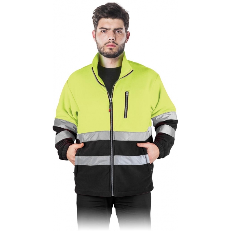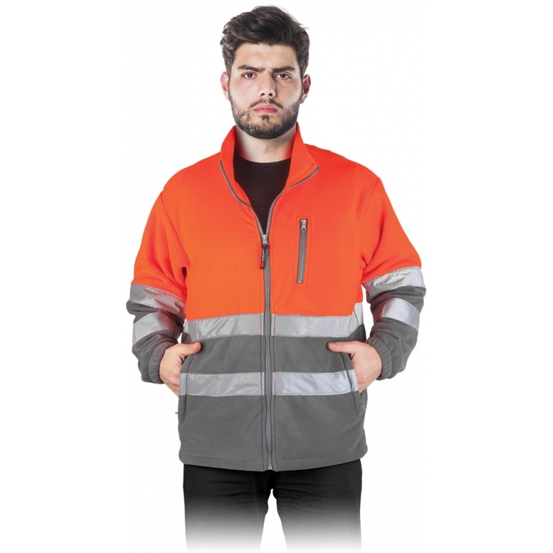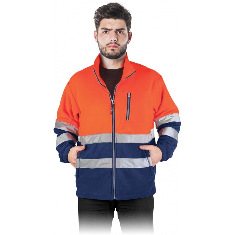 POLAR ODBLASKOWY RAW-POL POLSTRIP to męska bluza robocza wykonana z wysokiej jakości polaru o gramaturze 280 g/m². Zapinana na zamek błyskawiczny, wyposażona w kołnierz typu stójka oraz trzy kieszenie zapinane na suwak. Rękawy wykończone elastyczną lamówką, a fluorescencyjna tkanina z pasami odblaskowymi zapewnia doskonałą widoczność. Fason REGULAR gwarantuje wygodę i swobodę ruchów.