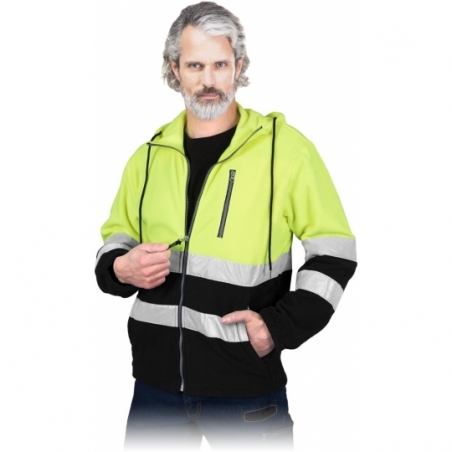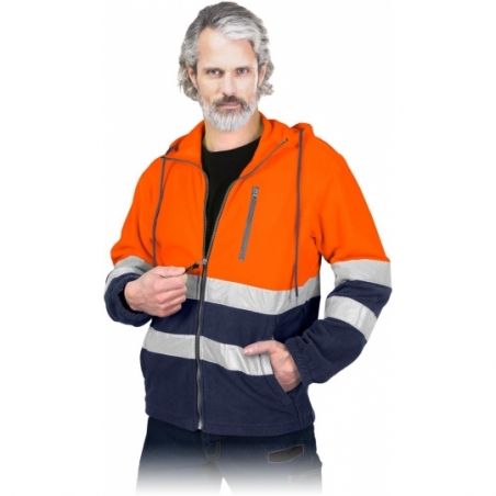 RAW-POL POLSTRIP‑HD to męska bluza ochronna z polaru o gramaturze 280 g/m², wyposażona w kaptur, pasy odblaskowe oraz trzy kieszenie na suwak. Wykonana z fluorescencyjnej tkaniny zwiększającej widoczność — idealna do pracy w warunkach ograniczonej widoczności oraz codziennego użytkowania.