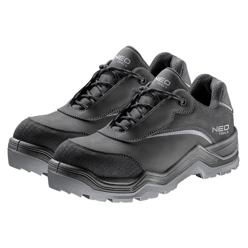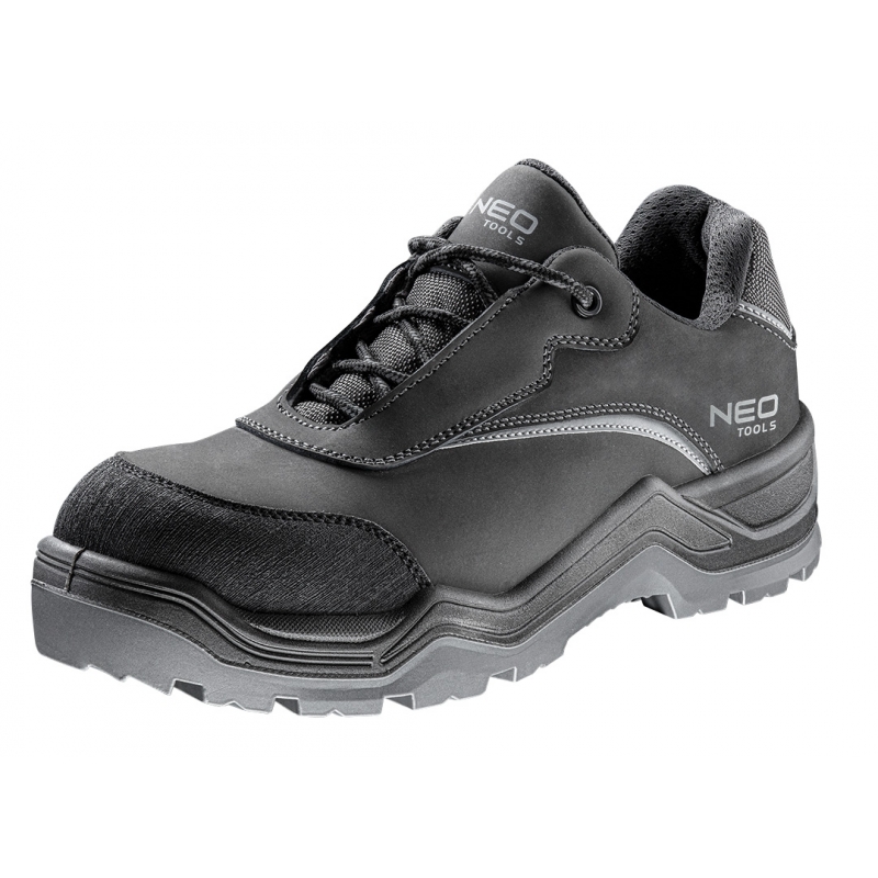 Półbuty robocze S3 SRC, bez elementów metalowych, rozmiar 39, nubukowe, podwyższone parametry odporności na przesiąkanie i przemiękanie, elementy odblaskowe, antypoślizgowa podeszwa z systemem absorbującym wstrząsy, odporna na ścieranie, oleje, benzynę i inne rozpuszczalniki organiczne, podeszwa wykonana z PU o dwóch gęstościach, podnosek z włókna szklanego wytrzymujący uderzenie do 200J, kewlarowa wkładka antyprzebiciowa, wkładka antyelektrostatyczna, sznurówki z wplecioną nicią odblaskową, czubek buta zabezpieczony dodatkową warstwą ochronną, zapiętek i język wzmocnione tkaniną Oxford, but wykonany w kategorii S3 SRC (SRC- odporność na poślizg na podłożu ceramicznym pokrytym roztworem laurylosiarczanu sodu (SLS) i na podłożu ze stali pokrytym glicerolem), certyfikat CE