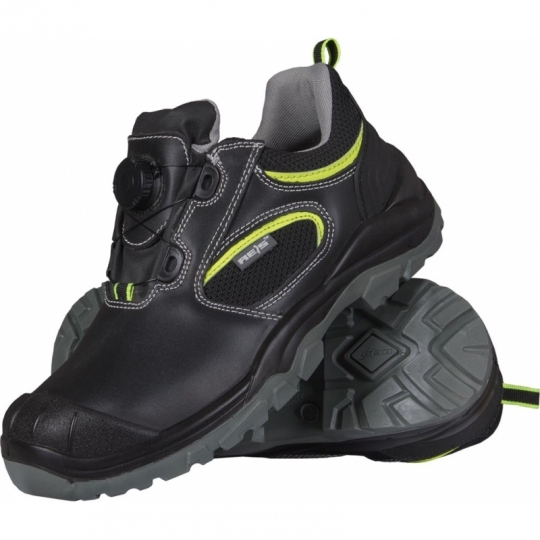 Buty bezpieczne GRU. - wykonane z gładkiej skóry - buty typu półbut, sięgające przed kostkę - podeszwa olejoodporna wykonana z poliuretanu - absorpcja uderzeń pod piętą - stalowy podnosek wytrzymały na uderzenia z energią 200 J oraz zgniecenia do 15 kN - gumowe oblanie, zapobiegające ścieraniu się czubka buta podczas tarcia nim o podłoże - unikalny system szybkiego zapinania za pomocą pokrętła - kategoria S1 - spełniają wymagania norm EN20345 oraz EN20344