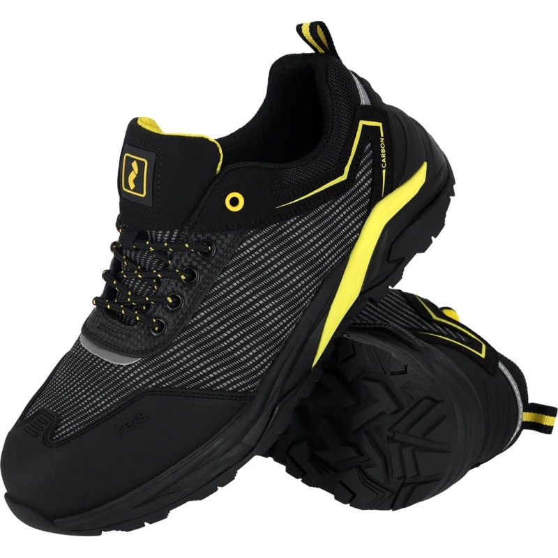 Buty bezpieczne CARBON, męskie. - wykonane z tkaniny poliestrowej w połączeniu z zamszową skórą syntetyczną (microfibrą) oraz wstawkami z TPU - buty typu półbut, sięgające przed kostkę - sznurowane - podeszwa antypoślizgowa, olejoodporna, antyelektrostatyczna, wykonana z EVA oraz gumy - absorpcja uderzeń pod piętą - niemetalowa, kompozytowa wkładka zabezpieczająca stopę przed przekłuciem o nacisku 1100N - kompozytowy podnosek wytrzymały na uderzenia z energią 200 J oraz zgniecenia do 15 kN - gumowe oblanie, zapobiegające ścieraniu się buta - bez metalowych wykończeń - METAL FREE - elementy odblaskowe - kategoria S3S FO SR