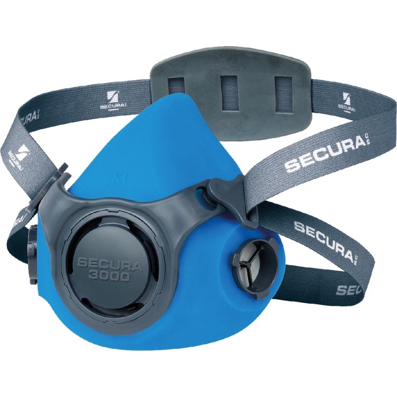 Półmaska SECURA 3000. - wykonana z najwyższej jakości materiałów z silikonową częścią twarzową - składa się z korpusu, dwóch zaworów wdechowych z łącznikami bagnetowymi umożliwiającymi montaż elementów oczyszczających, zaworu wydechowego oraz nagłowia - jednoczęściowe nagłowię tekstylne, które łączy się z półmaską za pośrednictwem zapinek i zaczepów pierścienia - po skompletowaniu z odpowiednimi elementami oczyszczającymi stanowi sprzęt ochrony układu oddechowego przed szkodliwymi substancjami występującymi pod postaci: aerozoli (pyły, dymy, mgły), par i gazów oraz obu tych postaci łącznie - możliwość połączenia z: SEC-FIL-A1, SEC-FIL-A1P2, SEC-FIL-P1NR, SEC-FIL-P1R