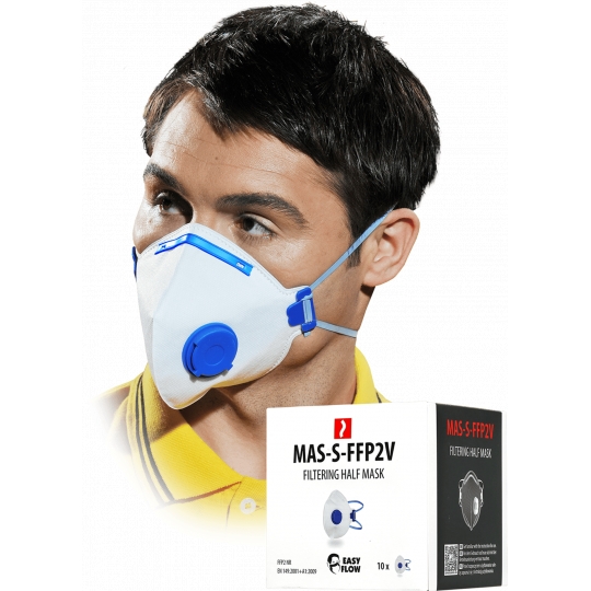RAW-POL MAS‑S‑FFP2V to półmaska przeciwpyłowa klasy FFP2 wyposażona w zawór wydechowy, przeznaczona do pracy w środowisku z nietoksycznymi i średniotoksycznymi aerozolami. Chroni przed pyłami, dymem metalicznym, drobnymi cząstkami, mgłą olejową oraz ozonem, a także sprawdza się jako maska antysmogowa. Stożkowy, profilowany kształt oraz piankowa poduszka na nosie zapewniają dobre dopasowanie i komfort użytkowania. Zgodna z normą EN 149.