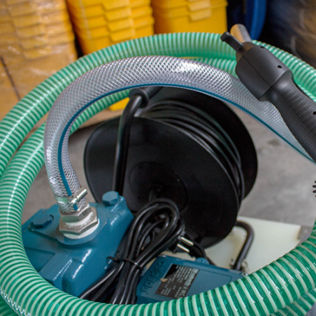 Zasilanie 230V, skład zestawu: wąż ssący o dł. 5 m, pompa, wąż nalewczy o dł. 10 m. Zestaw musi umożliwiać pompowanie olejów naftowych (przepracowanych) o gęstości 0,78-0,93. Zestaw wyposażony w przedłużacz przemysłowy bębnowy z gniazdami hermetycznymi o dł. łącznej 100 m. Pompa o wydajności min 30l/min i o mocy umożliwiającej pracę z wężami o podanej długości.