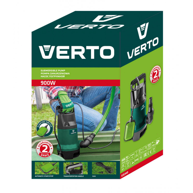 Pompa zanurzeniowa do wody brudnej 900W, wydajność 14 000 l/godz., maksymalna średnica zanieczyszczeń 35 mm, wys. podnoszenia wody 8.5 m, gł. zanurzenia 7 m, min. rozmiary szybu (LxWxH) 65 x 65 x 50 cm, średnica króćca do przewodu wodnego 1”, 1½”, stopień ochrony IPX8, przewód 10 m, wymiary urządzenia (LxH) 155 x 341 mm, masa 5.1 kg, akcesoria: króciec, złącze