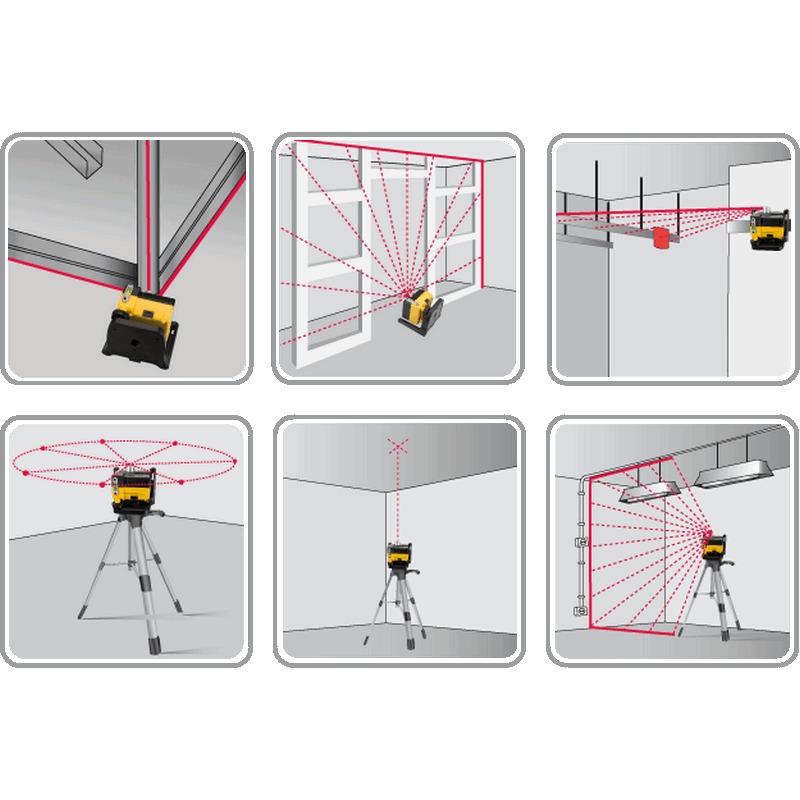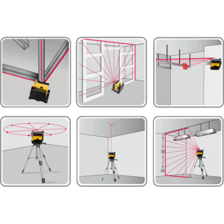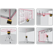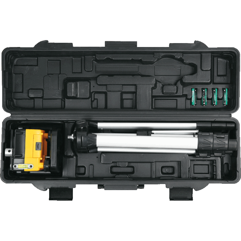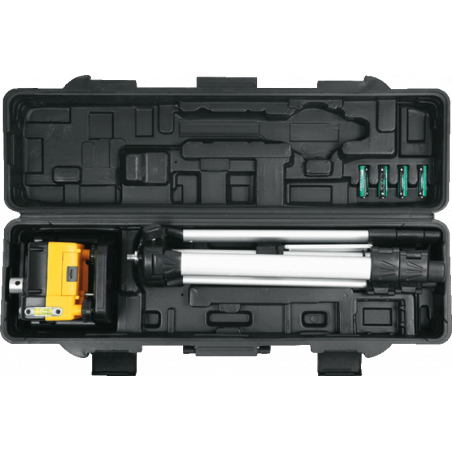 Poziomnica laserowa obrotowa, statyw, okulary, wyznaczanie płaszczyzny pionowej, wyznaczanie płaszczyzny poziomej, prędkość obrotowa wirowania do 500 obr./min, długość fali lasera 650 nm, klasa II, moc lasera ?1 mW, zasilanie: 4 baterie AA, zasięg do 30 m, masa 4.5 kg, walizka