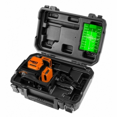 Laser 3D, zielony, zasięg- promień 20 m, dokładność: 0.3 mm/ 10 m, długość fali świetlnej 500-520 nm, zakres samopoziomowania 4°, czas pracy około 8h, IP54, akumulator Li-Ion, klasa II, moc lasera < 1 mW, laser wyświetlany w trzech płaszczyznach, zestaw: laser, tarcza celownicza, magnetyczny uchwyt, ładowarka, walizka, funkcja zablokowania lasera umożliwiająca wyznaczenie linii prostych pod dowolnymi kątami, sygnalizacja braku możliwości wypoziomowania poprzez miganie lasera, certyfikat CE na zgodność z normą EN60825-1:2014