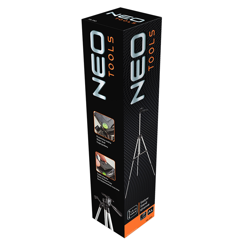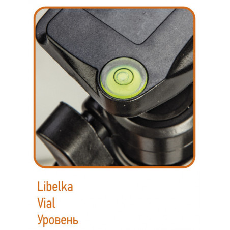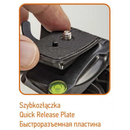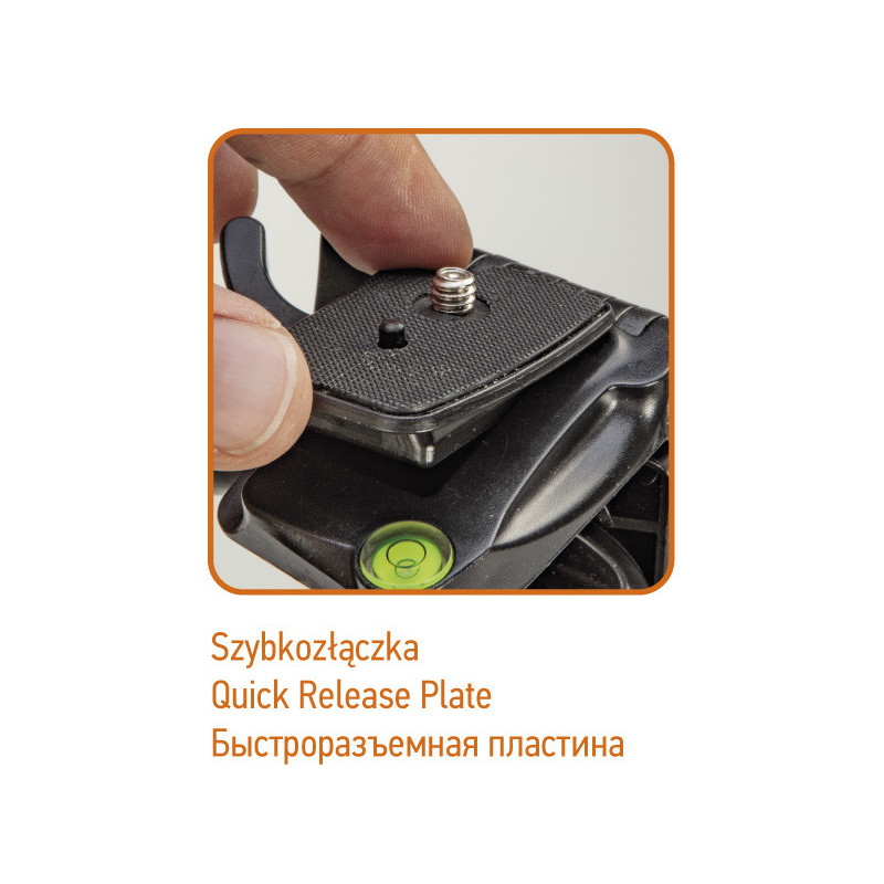 Statyw aluminiowy 1.5 m, gwint 1/4", regulacja wysokości do 150 cm, regulowana głowica, teleskopowe nogi blokowane zaciskami, lekka aluminiowa konstrukcja zapewniająca stabilność, libelka do poziomowania głowicy, szybkozłączka (płytka montażowa) z gumowaną powierzchnią