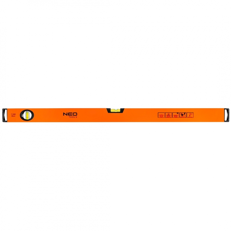 Poziomnica aluminiowa, 2 libelle, frezowana dolna powierzchnia, 80 cm, Aluminiowy profil o grubości 1.2 mm, Dokładność 0.5 mm/m, 2 libelki: pion, poziom, Libelki z materiału odpornego na uderzenia, Ciecz odporna na promieniowanie UV, Frezowana dolna powierzchnia miernicza , Zakończenia amortyzujące wstrząsy podczas upadku poziomnicy