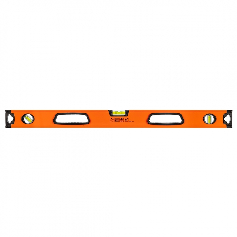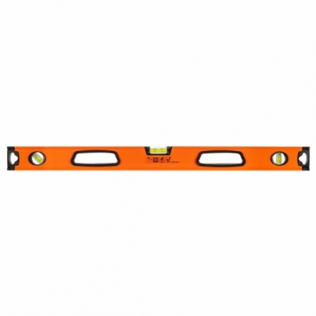 Poziomnica aluminiowa z uchwytem, 3 libelle, magnes, frezowane powierzchnie miernicze, 80 cm, Aluminiowy profil o grubości 1.3 mm, Dokładność 0.5 mm/m, 3 libelki: pion, poziom i 45°, Libelka pozioma z 6 liniami do poziomu oraz spadków 1% i 2%, Libelki z materiału odpornego na uderzenia, Ciecz odporna na promieniowanie UV, Frezowana dolna powierzchnia miernicza , Zakończenia amortyzujące wstrząsy podczas upadku poziomnicy, Z uchwytami, Z magnesem