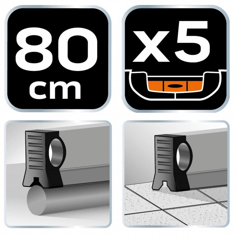 Poziomnica specjalna 80 cm, 5 libelli, różne kąty, 0°, 1.5°, 3.5°, 45°, 90°, (HxW) 80 x 30 mm, podstawa do rur