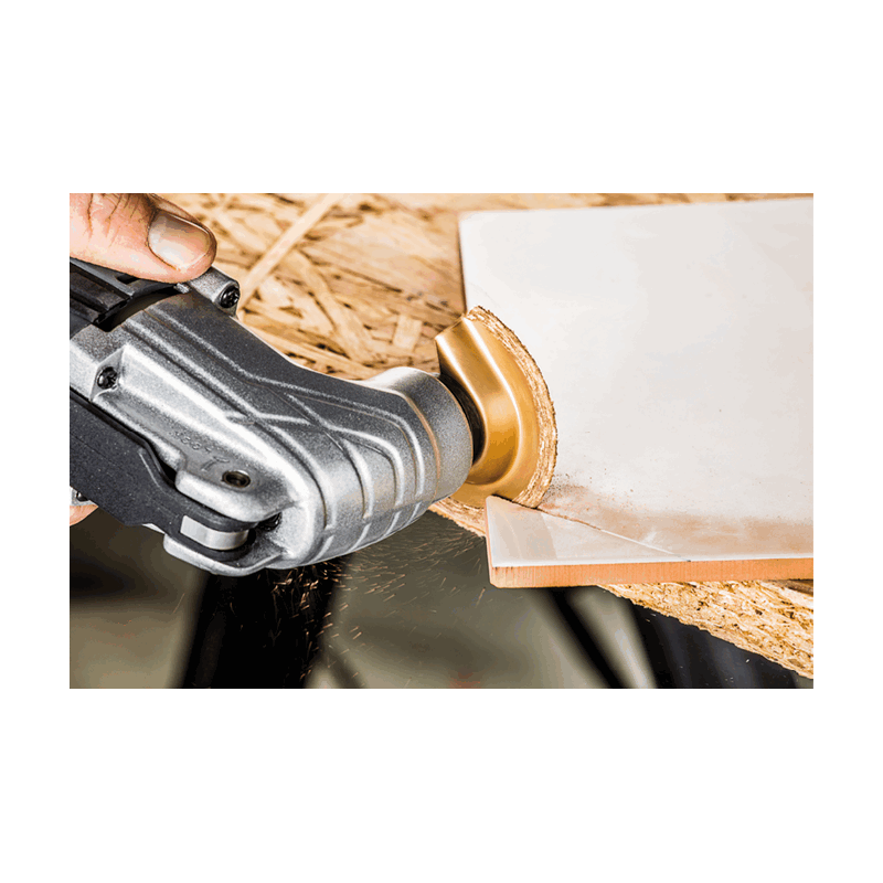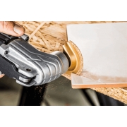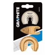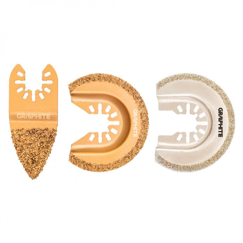 Zestaw brzeszczotów do urządzenia wielofunkcyjnego do obróbki ceramiki, 3 szt.: tarcza półokrągła, galwaniczne pokrycie nasypem diamentowm, średnica 65 mm; tarcza półokrągła HM - nasyp z węglika wolframu, średnica 64 mm; płytka ścierna HM - nasyp z węglika wolframu, długość 76 mm