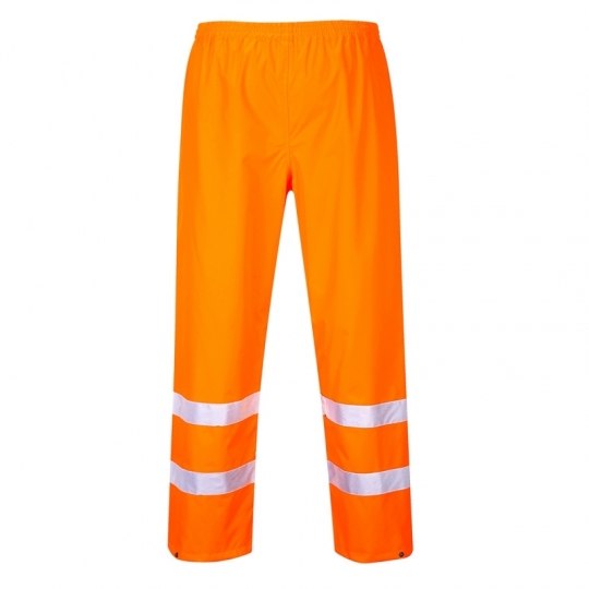 - Bardzo popularne spodnie ostrzegawcze przeciwdeszczowe i wiatroszczelne z elastycznym wykończeniem pasa. Można je nosić na innych spodniach. Końce nogawek zapinane na napy. Kieszenie przelotowe.