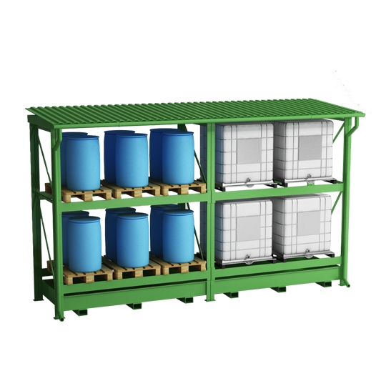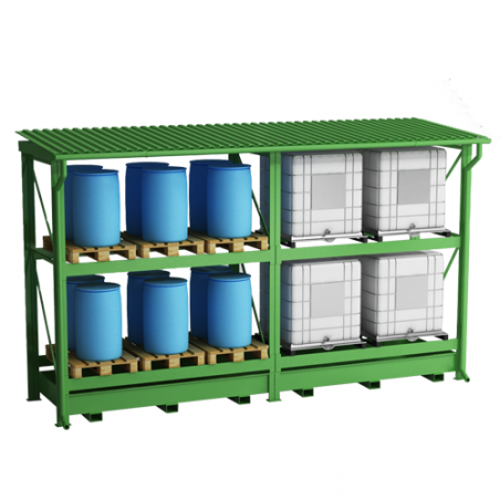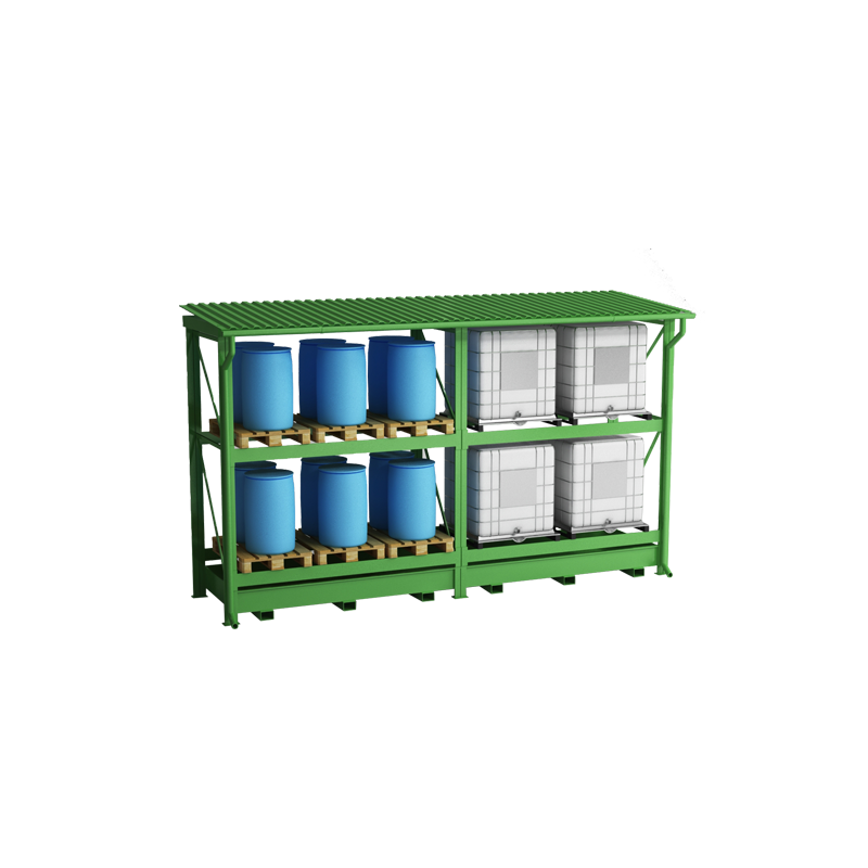Niezwykle stabilna konstrukcja do składowania 4 pojemników 1000 litrów lub 6 palet euro na dwóch poziomach.Wykonany z elementów stalowych najwyższej jakości. Regał w całości ocynkowany ogniowo. Regał posiada wannę wychwytową, do której mogą spływać ewentualne wycieki z pojemników IBC. Regał został wyposażony w spadzisty dach, aby opady nie gromadziły się na nim oraz w rynny do odprowadzania wody. Cała konstrukcja została wzbogacona o specjalne uchwyty, które ułatwiają przewożenie jej za pomocą wózka widłowego. Dzięki uniwersalnej konstrukcji regały można z sobą łączyć co pozwala na optymalne wykorzystanie powierzchni magazynowej. Opcjonalnie dostępne są zewnętrzne i tylne osłony ścian, półki kratownicowe.