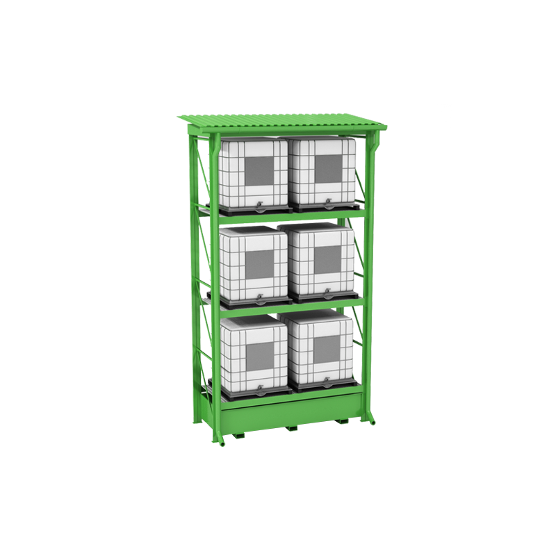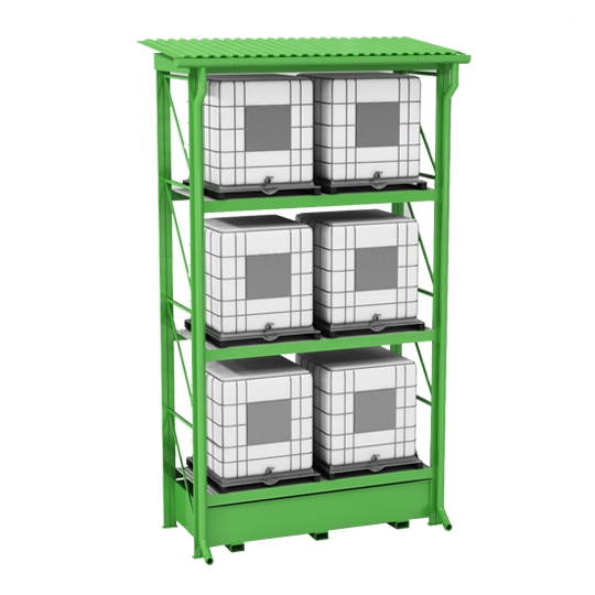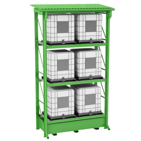 Niezwykle stabilna konstrukcja do składowania 6 pojemników IBC na trzech poziomach. Wykonany z elementów stalowych najwyższej jakości. Półki wykonane z kratek wema zapobiegają gromadzeniu się wycieków na poziomie składowania. Regał posiada wannę wychwytową, do której mogą spływać ewentualne wycieki z pojemników IBC. Regał został wyposażony w spadzisty dach, aby opady nie gromadziły się na nim oraz w rynny do odprowadzania wody. Cała konstrukcja została wzbogacona o specjalne uchwyty, które ułatwiają przewożenie jej za pomocą wózka widłowego. Składowanie w pionie to oszczędność miejsca w Twoim magazynie.