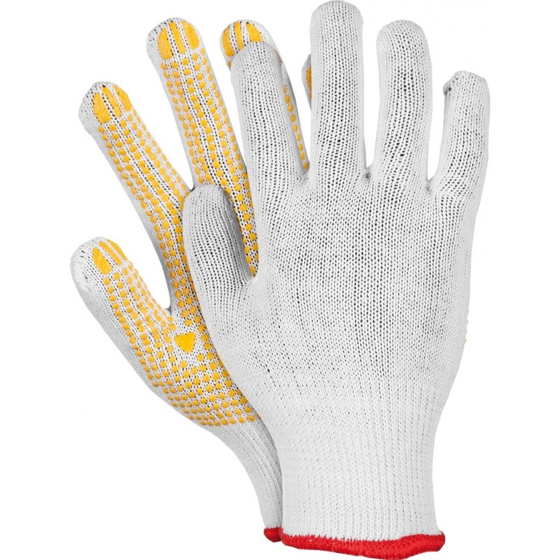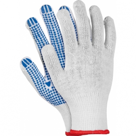 RAW-POL RDZN to uniwersalne rękawice ochronne wykonane z mieszanki poliestru i bawełny. Dzięki jednostronnemu nakropieniu PCV na części chwytnej zapewniają dobrą przyczepność i trwałość podczas przenoszenia towarów. Są przewiewne, rozciągliwe i zakończone ściągaczem, co gwarantuje komfort użytkowania przez cały dzień.