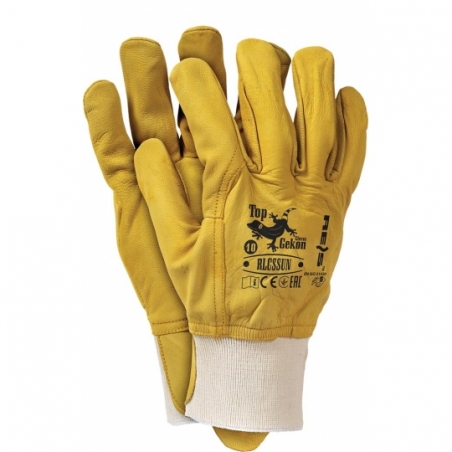 Rękawice ochronne wykonane ze skóry w żółtym kolorze. - skóra kozia licowa - całodłonicowe - część chwytna rękawicy wykonana z jednego kawałka skóry, dzięki czemu wykazują większą wytrzymałość i odporność na przetarcia - całoskórzane, czyli w całości wykonane ze skóry - zakończone elastycznym ściągaczem, dzięki czemu świetnie trzymają się na dłoni - dodatkowa skórzana ochrona na puls - wysoka jakość skóry tworzy te rękawice bardzo wytrzymałymi i odpornymi na zużycie - popularnie stosowane do ogólnych prac mechanicznych - wykorzystywane w budownictwie, przemyśle ciężkim