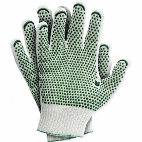 Rękawice ochronne dziane z jednostronnym nakropieniem. - wykonane metodą platerowania - wewnątrz bawełna, z zewnątrz poliamid HT - bezszwowe - dobrze przylegają do dłoni - nakropienie PCV na wewnętrznej części dłoni poprawia pewność chwytu i operowanie przedmiotami - bawełna wewnątrz zapewnia wysoki komfort pracy - zgodne z normami EN420 i EN388 (poziomy odporności 2 1 4 2)