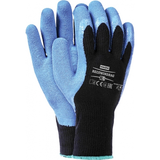 RAW-POL RECOWINDRAG to ocieplane rękawice ochronne wykonane z dzianiny z recyklingu (poliester i bawełna) z powleczeniem lateksem, zapewniające trwałość, odporność na ścieranie oraz komfort pracy w niskich temperaturach. Zakończone ściągaczem, idealne do prac magazynowych, budowlanych i transportowych.