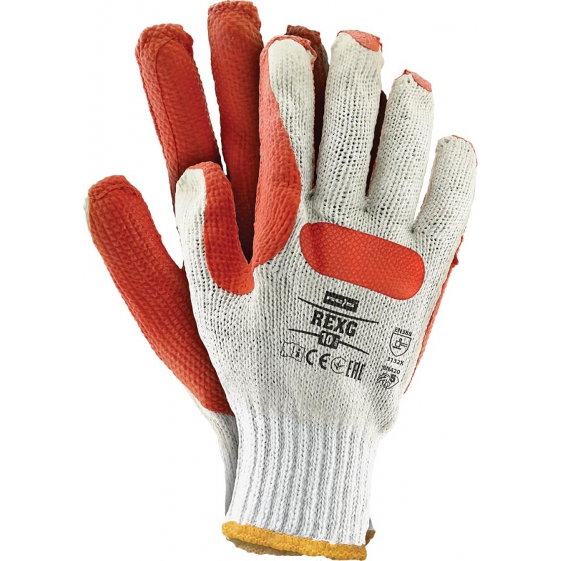 Rękawice ochronne powlekane zakończone ściągaczem. - wykonane z dzianiny - powlekane podwójnie wulkanizowaną gumą w kolorze pomarańczowym - bardzo odporne na ścieranie, przecieranie, a także rozdarcie - idealne dla brukarzy - stosowane w budownictwie oraz przemyśle transportowym - potocznie zwane extra grip - zgodne z normami EN388 (poziomy odporności: 3 2 3 2) i EN420