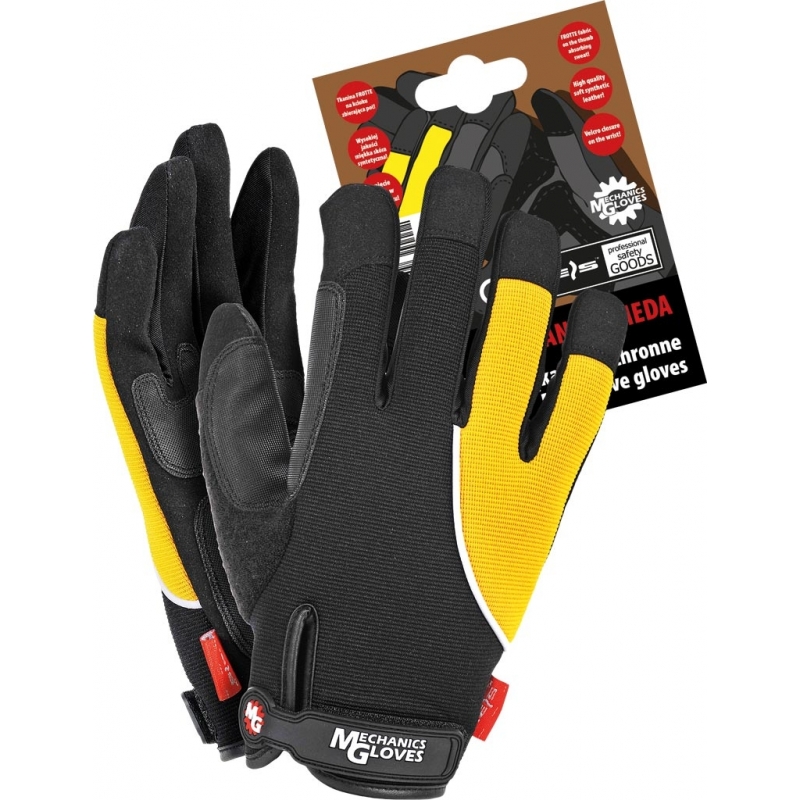 Rękawice ochronne wykonane z wysokiej jakości miękkiej skóry syntetycznej połączonej z tkaniną.