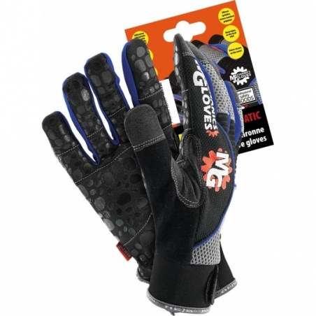 Rękawice ochronne wykonane z amary połączonej z tkaniną. - część wierzchnia wykonana z neoprenu oraz siatki - na części chwytnej powlekane silikonowym wzorem zapewniającym doskonałą chwytność - regulacja na rzep w nadgarstku zapewnia lepsze dopasowanie oraz szczelność rękawicy - bardzo wytrzymałe i odporne na zużycie dzięki wysokiej jakości skóry - popularnie stosowane do ogólnych prac mechanicznych - wykorzystywane w przemyśle motoryzacyjnym