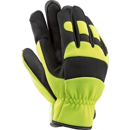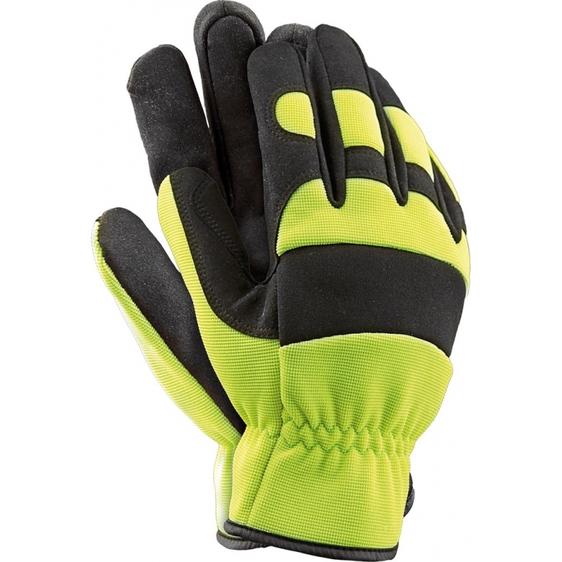 Rękawice ochronne wykonane z wysokiej jakości skóry syntetycznej połączonej z oddychającym materiałem spandex. - część wierzchnia wykonana ze spandexu we fluorescencyjnym kolorze żółtym, zwiększającym widoczność użytkownika z dodatkową wstawką z neoprenu na kostkach - część chwytna wykonana ze skóry syntetycznej - na końcówkach i kostkach palców wzmocnienia ze skóry co zwiększa wytrzymałość rękawicy - małe dziurki na palcach po bokach, zapewniające lepszy przepływ powietrza - marszczenie w nadgarstku sprawia, iż rękawica przylega do dłoni i lepiej chroni przed dostaniem się do jej wnętrza wiatru czy piasku - popularnie stosowana do ogólnych prac mechanicznych - polecane dla kierowców, drogowców oraz kadry kierowniczej
