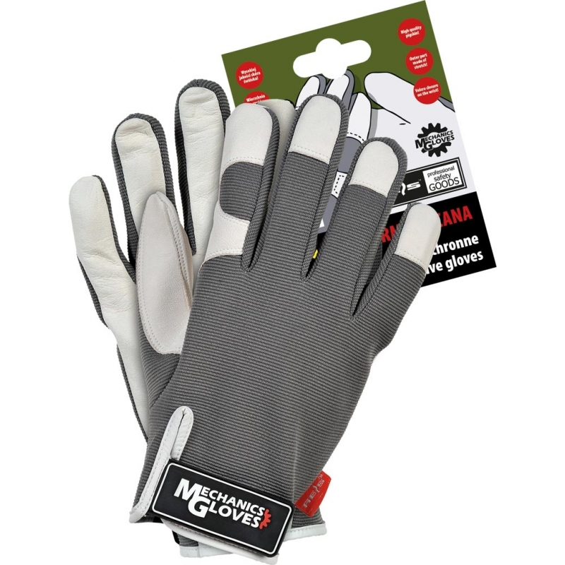 Rękawice ochronne wykonane z wysokiej jakości jasnej skóry świńskiej licowej połączonej z tkaniną. - wierzchnia część rękawicy wykonana ze streczu - całodłonicowe - część chwytna rękawicy wykonana z jednego kawałka skóry, dzięki czemu wykazują większą wytrzymałość i odporność na przetarcia - w nadgarstku zapięcie na rzep velcro, które umożliwia wygodną regulację - popularnie stosowane do ogólnych prac mechanicznych