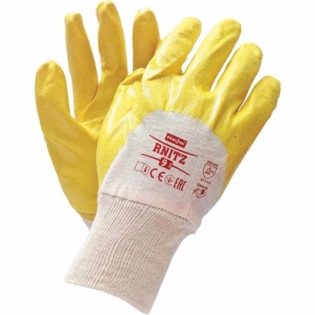 Rękawice ochronne powlekane nitrylem, zakończone ściągaczem. - część chwytna i do połowy część wierzchnia oblewane powłoką z nitrylu w kolorze żółtym - odporne na ścieranie, przetarcie czy też przebicie - zapewniają sprawność elastyczną - nitryl zwiększa odporność na smary, oleje, tłuszcze i węglowodory - zachowują swoją formę i tym samym mogą być prane - sprawdzają się w miejscach, gdzie następuje kontakt z wyżej wymienionymi substancjami - nitryl ulega biodegradacji, dzięki czemu rękawice nitrylowe są bezpieczne dla środowiska - doskonałe dla mechaników, wykorzystywane podczas przeładunku i transportu - zgodne z normami EN388 (4 1 1 1 X) i EN420