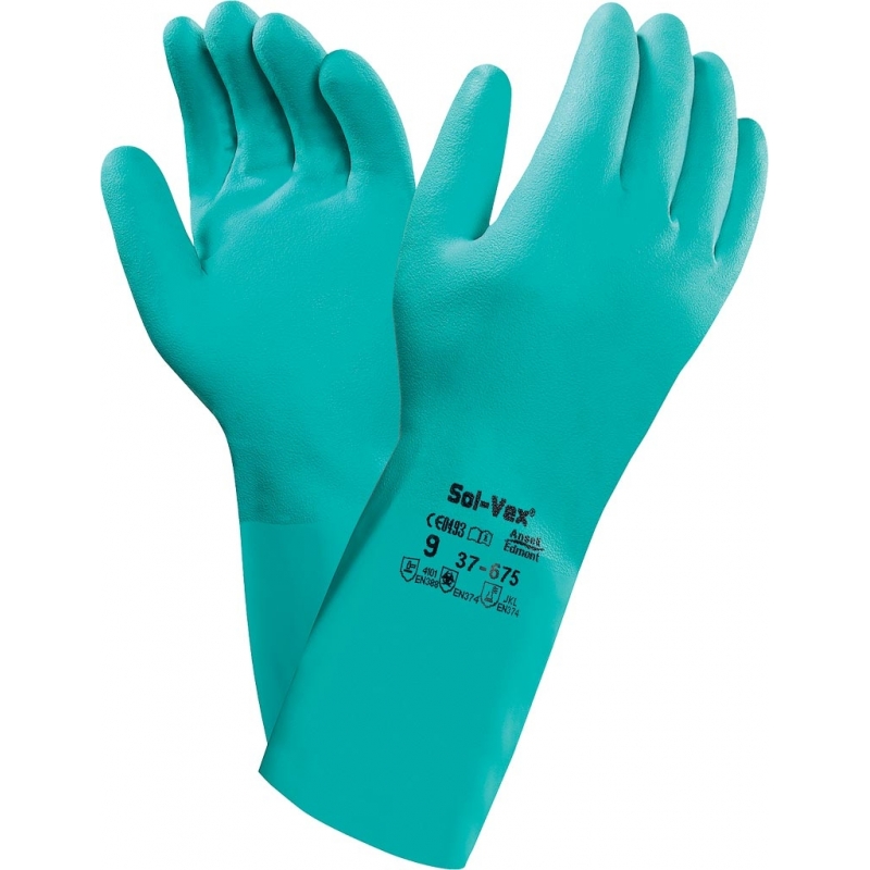 Antystatyczne rękawice ochronne Solvex® 37-675. - wykonane z nitrylu - flokowana bawełniana wyściółka w połączeniu z elastycznością nitrylowej emulsji zapewnia użytkownikowi wyjątkowy komfort - zaprojektowana tak, aby zapewnić optymalne wyniki w suchych i mokrych środowiskach, w których wymagana odporność na chemikalia - nadające się do wielokrotnego użycia, z niezrównaną ochroną przed obtarciami - są idealne tam, gdzie trzeba zapewnić bezpieczeństwo w szerokim zakresie środowisk pracy w obecności agresywnych środków chemicznych - dopuszczone do kontaktu z żywnością - zgodne z normą EN388 (poziomy odporności: 4 1 0 1) i EN374 (JKL), EN1149 i EN420