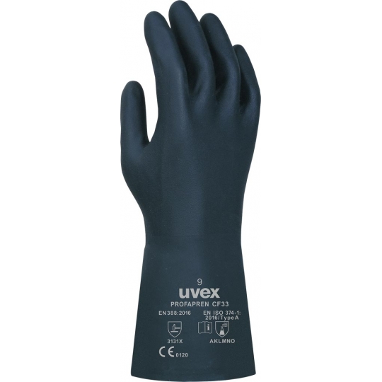 Rękawice ochronne PROFAPREN CF33. - wykonane z kauczuku neoprenowego - wewnętrzna powierzchnia rękawic pokryta jest flokiem, co ułatwia wkładanie i zdejmowanie oraz zapobiega poceniu się rąk w czasie użytkowania - długość ok. 32 cm - grubość ok. 0,71 mm - dobra chwytność w wilgotnych i mokrych miejscach dzięki strukturze Grip - wysoka odporność na wiele chemikaliów i rozpuszczalników - dobra manualność - dobra elastyczność i dopasowanie - spełniają wymagania norm EN388 (poziomy odporności: 3 1 3 1), EN374-1