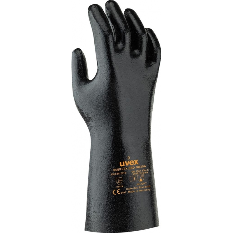 Antystatyczne rękawice ochronne RUBIFLEX ESD. - wykonane z kauczuku NBR, zapewniają wyjątkowy komfort użytkowania - bawełniana wyściółka zapewniająca bardzo dobrą absorpcje pary wodnej - długość ok. 35 cm - grubość ok. 0,40 mm - ergonomiczne dopasowanie - dobre właściwości mechaniczne - dobra odporność na wiele rodzajów substancji chemicznych, np. smary, oleje - mogą być używane w miejscach zagrożonych wybuchem i takich, w których występują wyładowania elektrostatyczne - bardzo duża elastyczność i lekkość - spełniają wymagania norm EN388 (poziomy odporności: 2 1 1 1), EN374-1 oraz EN16350