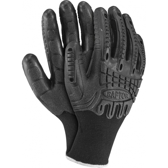 Rękawice ochronne, powlekane. - wykonane z bawełny i włókien poliuretanowych - powlekane miękkim tworzywem TPR o specjalnej strukturze stanowiącej doskonałą barierę dla słabych uderzeń i drgań - nie tracą elastyczności nawet w niskich temperaturach - rozciągliwe i wytrzymałe - zakończone ściągaczem - wygodne w użytkowaniu - nie stwarzają trudności w operowaniu narzędziem - grubsza warstwa TPR na kostkach i palcach zabezpiecza przed uderzeniami - wykorzystywane w budownictwie oraz przemyśle transportowym
