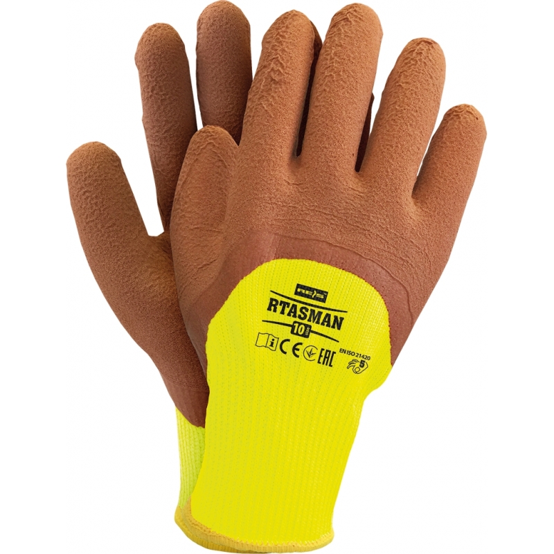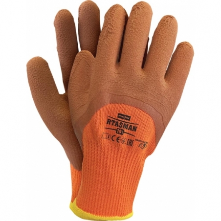 RAW-POL RTASMAN to ocieplane rękawice ochronne powlekane spienionym lateksem, z podwójną warstwą (poliester zewnętrzny, frotte wewnętrzne) zapewniającą ciepło i komfort. Przeznaczone do pracy w niskich temperaturach, z ściągaczem i zwiększoną chwytnością.