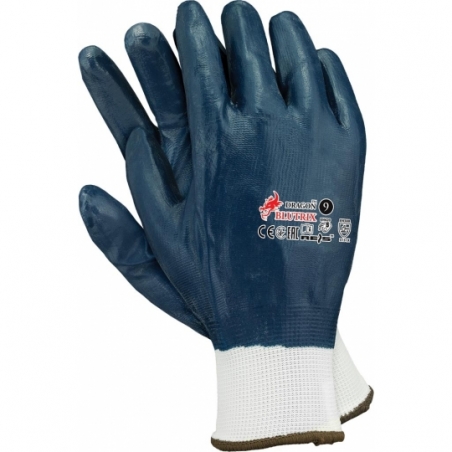 Rękawice ochronne wykonane z poliestru, powlekane nitrylem, zakończone ściągaczem.