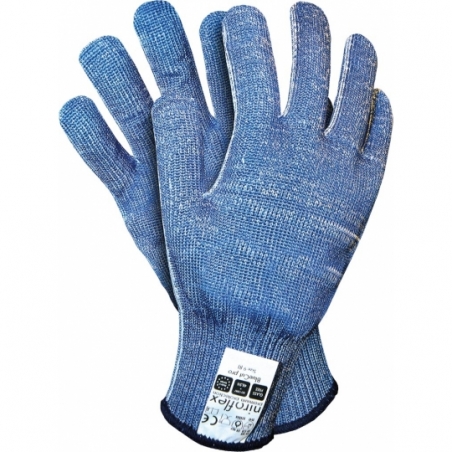 Rękawice ochronne niroflex BlueCut pro. - wykonane z mieszanki tworzywa Brinix® A8C, poliestru oraz stali nierdzewnej - nie zawierają włókien szklanych - przeznaczone do pracy w systemie HACCP - dopuszczone do kontaktu z żywnością - pasują na prawą i lewą rękę - mogą być prane w pralce w temperaturze 85°C - zapewniają doskonałą manualność - odporne na ciepło kontaktowe do 100°C - najwyższy współczynnik odporności na przecięcie (5) oraz na rozdarcie (4) - najmniejszą jednostką sprzedaży jest sztuka - testowane na przecięcie zgodnie z EN13997 (=48,5N) - spełniają wymagania norm EN420, EN388 (poziomy odporności 3 5 4 1) oraz EN407 (poziomy odporności X 1 X X X X)