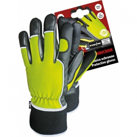 Rękawice ochronne, ocieplane, wykonane z wysokiej jakości skóry Microthan połączonej ze streczem. - część wierzchnia wykonana ze streczu we fluorescencyjnym kolorze seledynowym z dodatkowymi odblaskowymi lamówkami co zwiększa widoczność użytkownika - część chwytna wykonana z wysokiej jakości skóry Microthan cechującej się bardzo dobrą wytrzymałością - ocieplona wkładką, zapewniającą izolację od zimna - ściągacz w nadgarstku zwiększa dopasowanie rękawicy - zakończone usztywnianym mankietem - popularnie stosowane do ogólnych prac mechanicznych