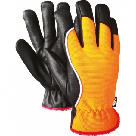 Rękawice ochronne, ocieplane, wykonane z wysokiej jakości skóry Microthan połączonej ze streczem. - część wierzchnia wykonana ze streczu we fluorescencyjnym kolorze pomarańczowym z dodatkową odblaskową lamówką co zwiększa widoczność użytkownika - część chwytna wykonana z wysokiej jakości skóry Microthan cechującej się bardzo dobrą wytrzymałością - ocieplona wkładką, zapewniającą izolację od zimna - ściągacz w nadgarstku zwiększa dopasowanie rękawicy - popularnie stosowane do ogólnych prac mechanicznych