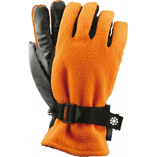 Rękawice ochronne ocieplane z polaru oraz wodoodpornej tkaniny. - część wierzchnia wykonana z polaru w kolorze pomarańczowym co zwiększa widoczność użytkownika - część chwytna wykonana z czarnej tkaniny o właściwościach wodoodpornych z dodatkowym wzmocnieniem - podszewka ocieplona tkaniną THINSULATE, zapewniającą doskonałą izolację od zimna oraz komfort noszenia - w nadgarstku na wierzchniej stronie regulacja na pasek, umożliwiająca lepsze dopasowanie - stanowią idealną ochronę przed zimnem - doskonale sprawdzają się w trudnych warunkach pracy zimą, jak i podczas uprawiania sportów zimowych