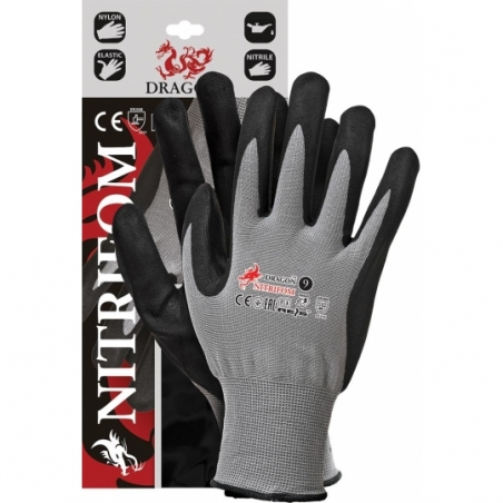 Rękawice ochronne wykonane z nylonu, powlekane spienianym nitrylem. - powlekane spienianym nitrylem typu FOAM w kolorze czarnym - zakończone ściągaczem - charakteryzują się zwiększoną odpornością na ścieranie - zapewniają manualność oraz doskonałe czucie trzymanego przedmiotu - nitryl zwiększa odporność na smary i oleje, a technologia FOAM zwiększa elastyczność rękawicy - sprawdzają się w miejscach, gdzie następuje kontakt z wyżej wymienionymi substancjami - wykorzystywane do ogólnych prac mechanicznych - każda para pakowana jest w osobną torebkę dzięki czemu świetnie się prezentują i są idealne na wszelkiego rodzaju prezentacje - zgodne z normami EN388 (poziomy odporności: 3 1 2 1 X) i EN420