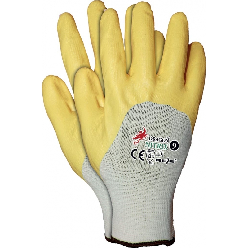 - część chwytna i do połowy część wierzchnia oblewane powłoką z nitrylu w kolorze żółtym