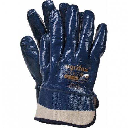 Rękawice ochronne powlekane nitrylem, zakończone usztywnianym mankietem. - część wierzchnia i chwytna oblana powłoką z nitrylu w kolorze granatowym - nitryl zwiększa odporność na smary, oleje, tłuszcze i węglowodory - sprawdzają się w miejscach, gdzie następuje kontakt z wyżej wymienionymi substancjami - doskonałe dla mechaników, wykorzystywane podczas przeładunku i transportu